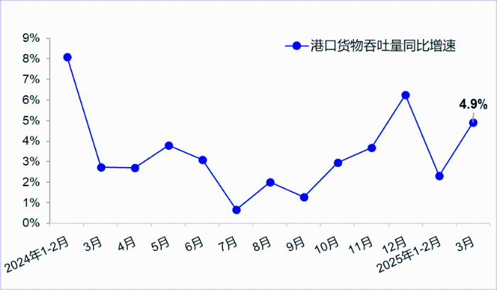 一季度,完成港口貨物吞吐量42.2億噸,同比增長3.2%。其中,內、外貿吞吐量同比分別增長4.1%和1.4%。完成集裝箱吞吐量8303萬標箱,同比增長8.2%。