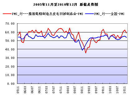 2010年12月,服裝鞋帽制造業(yè),本月為季節(jié)性高點(diǎn)。PMI為58.7,比4年來(lái)同月平均值55.85轉(zhuǎn)好;PMI三月移動(dòng)平均為60.6,比幾年來(lái)本月三月移動(dòng)平均值58.21轉(zhuǎn)好,(行業(yè)PMI領(lǐng)先行業(yè)利潤(rùn)總額6個(gè)月相關(guān)系數(shù)為-0.66。)利潤(rùn)趨勢(shì)為-4.1,比4年來(lái)同月平均值-0.4轉(zhuǎn)差;利潤(rùn)趨勢(shì)三月移動(dòng)平均為-3.1,自拐點(diǎn)以來(lái)合計(jì)值為-32.1,秋冬季需求,羽絨服訂單指數(shù)上升。未來(lái)盈利能力較差。服裝鞋帽制造及皮毛羽絨制品業(yè):短期盈利能力排序?yàn)榈?,長(zhǎng)期盈利能力排序?yàn)榈?。