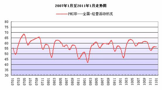 2011年1月,中國物流與采購聯合會(CFLP)發布的中國非制造業商務活動指數為56.4%,比上月回落0.1個百分點。由于非制造業沒有綜合指數,通常以商務活動狀況指數來反映非制造業經濟的總體變化。本月中國非制造業PMI各單項指數中,新訂單指數、積壓訂單指數和業務活動預期指數的環比有所回升,其余主要指數則呈現不同程度的回落。