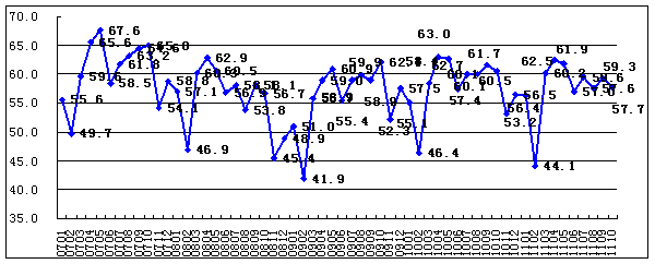 中國非制造業(yè)商務(wù)活動指數(shù)走勢圖(%)