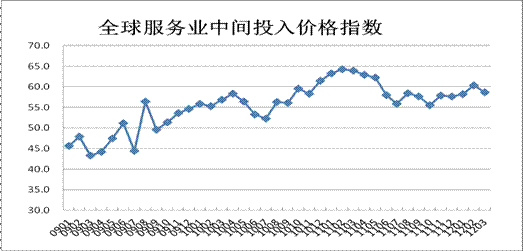 中間投入價格仍保持高位運行。3月,全球服務業的中間投入價格指數較上月有所回調,但仍運行在58.6%的高位,自2009年8月以來,該指數一直運行在50%以上。中間投入價格的高位運行反映出高油價推升了服務業的經營成本。