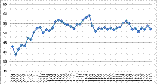 2009年1月—2012年10月全球服務(wù)業(yè)新訂單指數(shù)