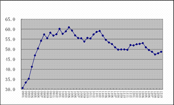 2009年1月-2012年10月全球制造業PMI指數走勢
