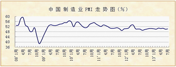 中國物流與采購聯合會、國家統計局服務業調查中心發布的2013年7月份中國制造業采購經理指數(PMI)為50.3%,比上月回升0.2個百分點。新訂單指數、企業預期指數、購進價格指數等主要分項指數都呈現不同程度回升,顯示下半年開局良好,經濟走勢穩中趨升。