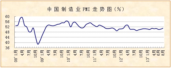 中國物流與采購聯合會、國家統計局服務業調查中心發布的2013年8月份中國制造業采購經理指數(PMI)為51.0%,比上月上升0.7個百分點。PMI指數最近兩月連續回升,本月回升幅度明顯擴大,主要分項指數全部上升,特別是新訂單指數、新出口訂單指數回升明顯,超過1個百分點,企業生產經營活動預期指數回升達到3個百分點,顯示當前宏觀經濟保持穩定增長的基礎進一步鞏固。