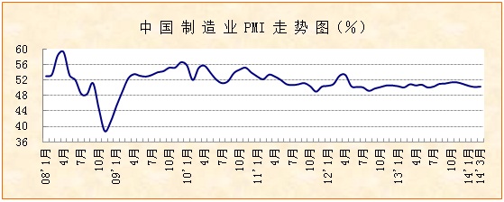 中國物流與采購聯合會、國家統計局服務業調查中心發布的2014年3月份中國制造業采購經理指數(PMI)為50.3%,較上月微升0.1個百分點。該指數結束連續三個月回落,新訂單、生產等主要分項指數均有小幅回升,但回升幅度低于往年同期水平,反映出指數回升力度有所偏弱。