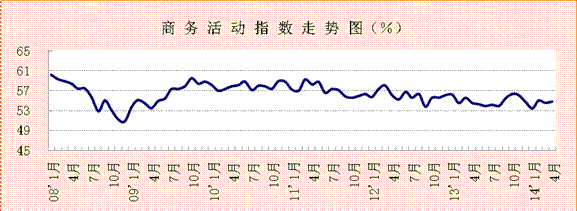 中國物流與采購聯(lián)合會、國家統(tǒng)計局服務(wù)業(yè)調(diào)查中心發(fā)布的2014年4月份商務(wù)活動指數(shù)達到54.8%,環(huán)比上升0.3個百分點。新訂單指數(shù)止跌趨穩(wěn),與上月持平;中間投入價格指數(shù)連續(xù)三個月穩(wěn)定在52%附近,收費價格指數(shù)連續(xù)三個月穩(wěn)定在49%附近;企業(yè)預(yù)期保持在61%以上的高位,與上月持平。綜合主要數(shù)變化,市場經(jīng)營活動較上月加快,需求增速沒有進一步放緩,價格走勢穩(wěn)定,企業(yè)預(yù)期依然較好,非制造業(yè)經(jīng)濟延續(xù)快速增長勢頭,有利于經(jīng)濟繼續(xù)走穩(wěn)向好。