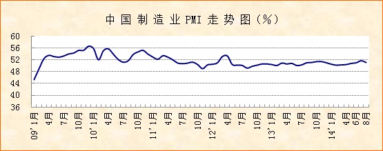 中國物流與采購聯合會、國家統計局服務業調查中心發布的2014年8月份中國制造業采購經理指數(PMI)為51.1%,比上月回落0.6個百分點。該指數雖然有所回落,但仍保持在51%以上。綜合來看,當前經濟運行基本平穩態勢沒有改變。