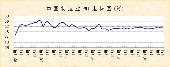 中國物流與采購聯合會、國家統計局服務業調查中心發布的2014年9月份中國制造業采購經理指數(PMI)為51.1%,同上月持平。從主要分項指數來看,有升有降,生產、新出口訂單指數有所上升,從業人員指數持平,產成品庫存指數下降,大中型企業PMI指數穩中有升。結合前兩月來看,三季度PMI指數平均水平為51.3%,略高于今年上半年和去年同期,顯示三季度經濟運行基本平穩,增速仍處在適度、合理區間。