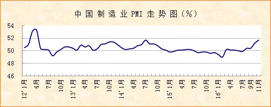 中國物流與采購聯合會、國家統計局服務業調查中心發布的2016年11月份中國制造業采購經理指數(PMI)為51.7%,較上月上升0.5個百分點,該指數最近兩月上升明顯,指數水平達到2014年8月份以來的最高值,高于去年同期2.1個百分點。主要分項指數新訂單、生產、采購量指數普遍回升,高于去年同期2個百分點以上。綜合來看,當前經濟運行態勢良好,企穩基礎進一步鞏固,向好發展態勢更為明顯。