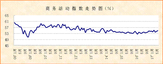 中國物流與采購聯合會、國家統計局服務業調查中心發布的2017年6月份中國非制造業商務活動指數連續兩個月環比上升,本月上升0.4個百分點,達到54.9%,連續九個月保持在54%以上。新訂單指數為51.4%,環比上升0.5個百分點,連續兩個月環比上升。非制造業經營活動和市場需求增速均呈現持續加快趨勢。同時,銷售價格和就業活動較上月均有好轉,企業預期也趨于樂觀,相關指數較上月均有不同程度上升。綜合各主要指數變化,非制造業運行呈現穩固向好發展態勢。