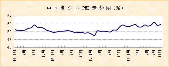 中國物流與采購聯合會、國家統計局服務業調查中心發布的2017年11月份中國制造業采購經理指數(PMI)為51.8%,較上月上升0.2個百分點。該指數自去年10月份以來連續14個月保持在51%以上較高水平,11月份為今年以來的次高點。主要分項指數新訂單、生產、采購量指數普遍上升,均在去年同期水平之上。綜合來看,供需雙側聯動上升,市場價格漲勢有所減緩,企業生產經營環境進一步改善,經濟運行穩中向好態勢繼續深入發展。