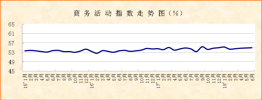 中國物流與采購聯合會、國家統計局服務業調查中心發布的2018年6月份中國非制造業商務活動指數環比上升0.1個百分點,達到55%。今年以來,該指數持續穩定在54%以上的較高水平,自3月開始連續上升,上半年均值為54.8%,較去年同期上升0.2個百分點,表明非制造業繼續保持穩中趨好的發展趨勢。